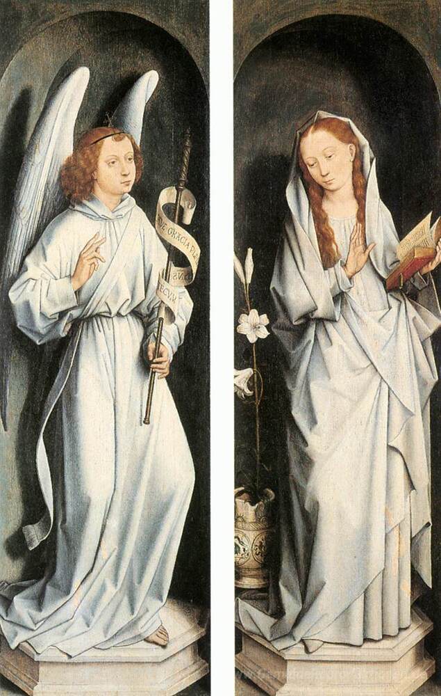 Wir bieten Ihnen eine handgefertigte Reproduktion auf Leinwand des berühmten Kunstwerks 'Verkündigung' von Hans Memling, aus dem Reproduktionsmuseum.