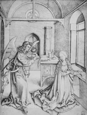 Wir bieten Ihnen eine handgefertigte Reproduktion auf Leinwand des berühmten Kunstwerks 'Verkündigung' von Martin Schongauer, aus dem Reproduktionsmuseum.