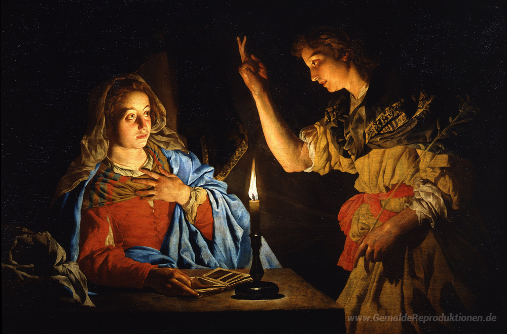 Wir bieten Ihnen eine handgefertigte Reproduktion auf Leinwand des berühmten Kunstwerks 'Verkündigung' von Matthias Stom, aus dem Reproduktionsmuseum.