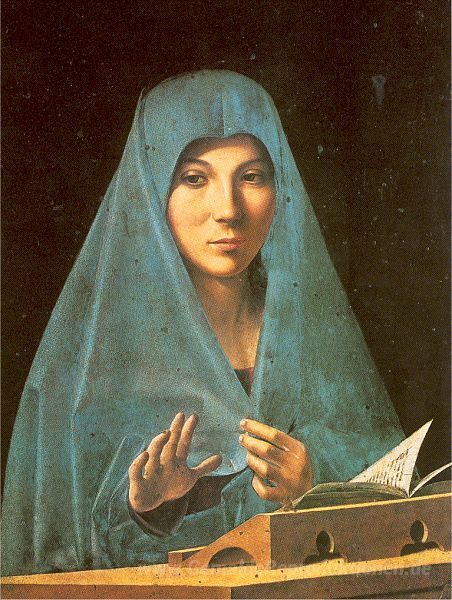 Wir bieten Ihnen eine handgefertigte Reproduktion auf Leinwand des berühmten Kunstwerks 'Virgin Annunciate' von Antonello da Messina, aus dem Reproduktionsmuseum.
