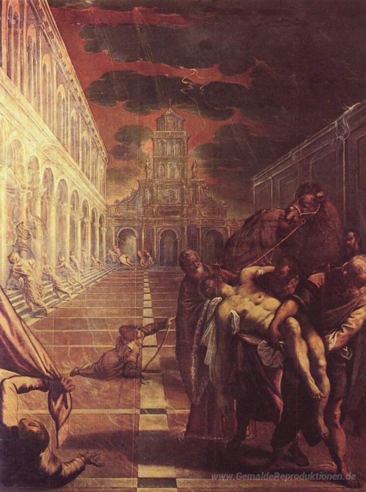 Wir bieten Ihnen eine handgefertigte Reproduktion auf Leinwand des berühmten Kunstwerks 'Wiederherstellung der Leiche von St Mark' von Tintoretto, aus dem Reproduktionsmuseum.