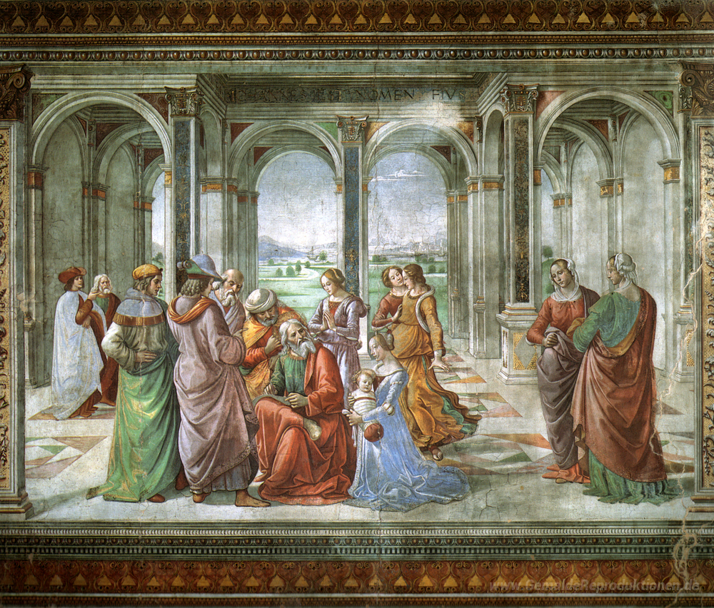 Wir bieten Ihnen eine handgefertigte Reproduktion auf Leinwand des berühmten Kunstwerks 'Zacharias schreibt den Namen seines Sohnes' von Domenico Ghirlandaio, aus dem Reproduktionsmuseum.