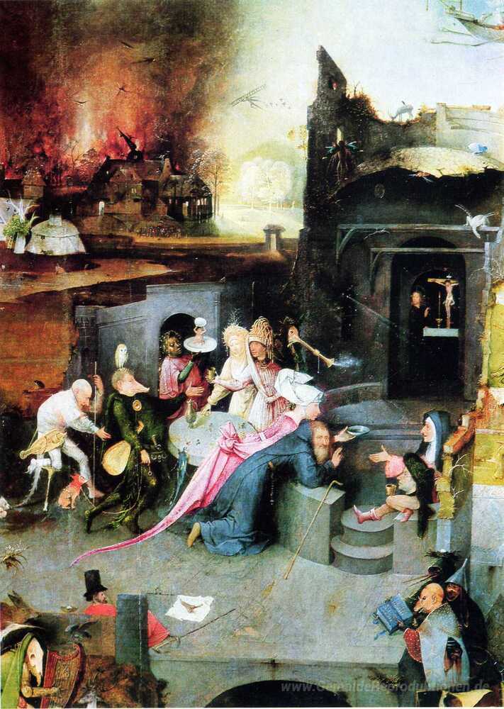 Wir bieten Ihnen eine handgefertigte Reproduktion auf Leinwand des berühmten Kunstwerks 'Versuchung des heiligen Antonius (Detail)' von Hieronymus Bosch, aus dem Reproduktionsmuseum.