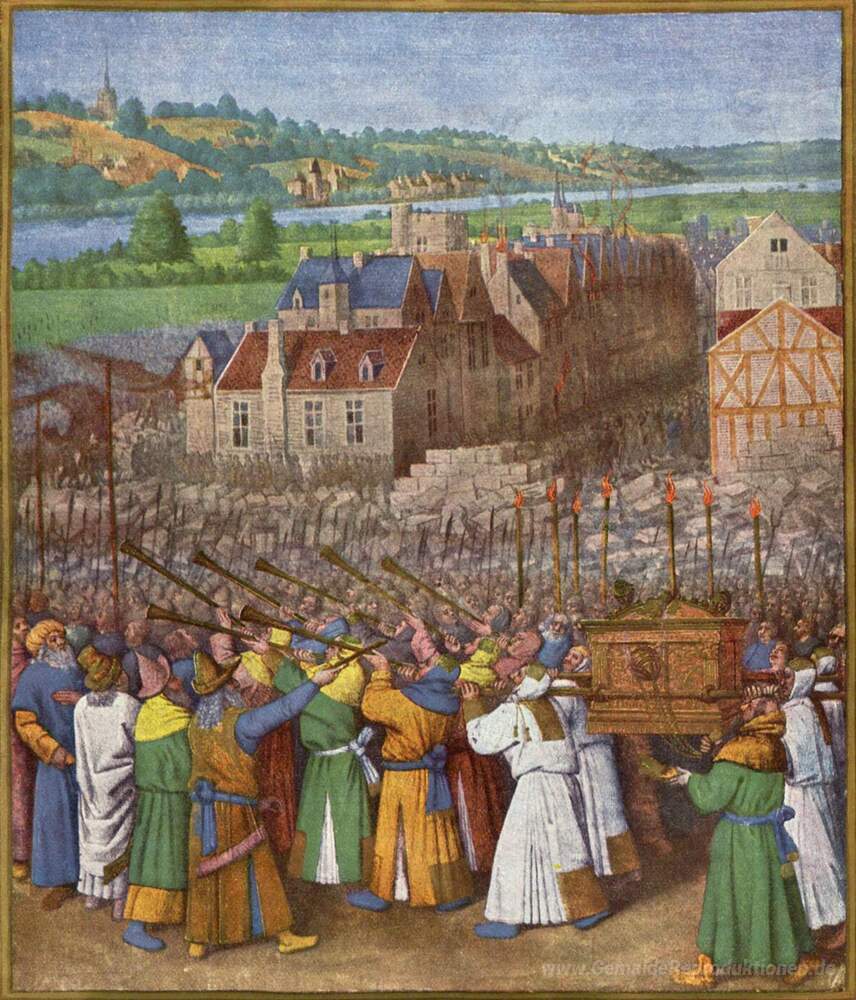 Wir bieten Ihnen eine handgefertigte Reproduktion auf Leinwand des berühmten Kunstwerks 'Battle of Jericho' von Jean Fouquet, aus dem Reproduktionsmuseum.