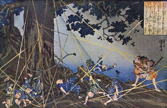 Wir bieten Ihnen eine handgefertigte Reproduktion auf Leinwand des berühmten Kunstwerks 'Blitz Emanation des großen Baum, der Kawabe keine Omi ist im Beg' von Utagawa Kuniyoshi, aus dem Reproduktionsmuseum.