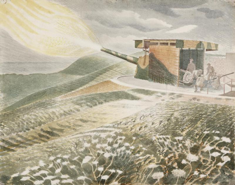 Wir bieten Ihnen eine handgefertigte Reproduktion auf Leinwand des berühmten Kunstwerks 'Brennen einer 9.2 Gun' von Eric Ravilious, aus dem Reproduktionsmuseum.