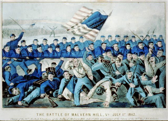 Wir bieten Ihnen eine handgefertigte Reproduktion auf Leinwand des berühmten Kunstwerks 'Der Kampf von Malvern Hügel, VA. 1. Juli 1862' von Currier and Ives, aus dem Reproduktionsmuseum.