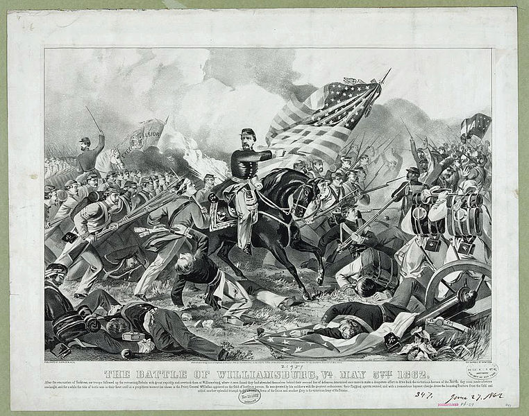 Wir bieten Ihnen eine handgefertigte Reproduktion auf Leinwand des berühmten Kunstwerks 'Der Kampf von Williamsburg, Va. 5. Mai 1862' von Currier and Ives, aus dem Reproduktionsmuseum.