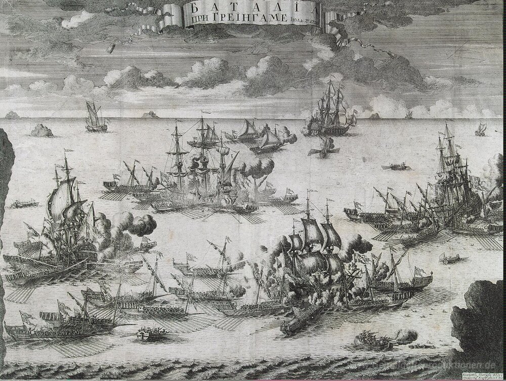 Wir bieten Ihnen eine handgefertigte Reproduktion auf Leinwand des berühmten Kunstwerks 'Die Schlacht von Grengam, 27. Juni 1720' von Alexey Zubov, aus dem Reproduktionsmuseum.