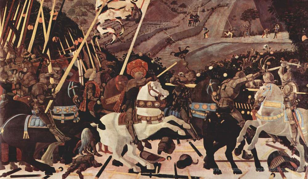 Wir bieten Ihnen eine handgefertigte Reproduktion auf Leinwand des berühmten Kunstwerks 'Die Schlacht von San Romano' von Paolo Uccello, aus dem Reproduktionsmuseum.