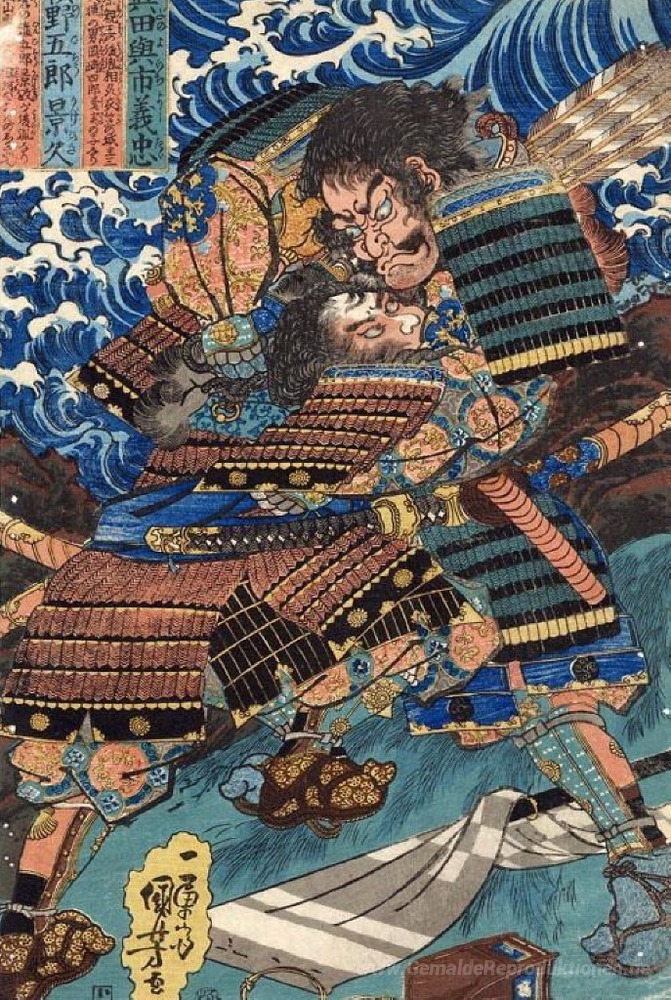 Wir bieten Ihnen eine handgefertigte Reproduktion auf Leinwand des berühmten Kunstwerks 'Gestalten Sie das Struggle' von Utagawa Kuniyoshi, aus dem Reproduktionsmuseum.