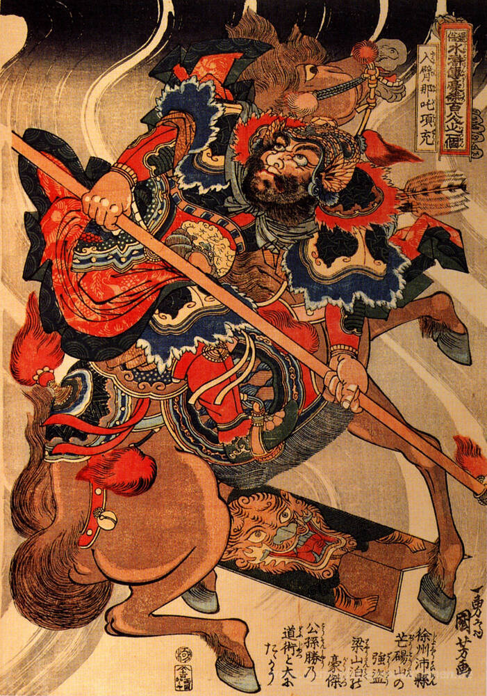 Wir bieten Ihnen eine handgefertigte Reproduktion auf Leinwand des berühmten Kunstwerks 'Happinata Koju auf steigendem Pferd' von Utagawa Kuniyoshi, aus dem Reproduktionsmuseum.