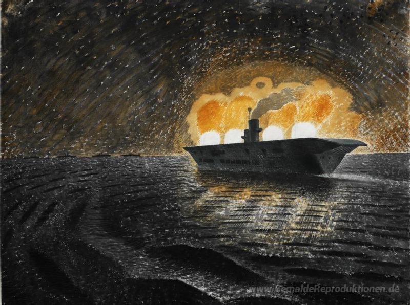 Wir bieten Ihnen eine handgefertigte Reproduktion auf Leinwand des berühmten Kunstwerks 'HMS Ark Royal in Aktion' von Eric Ravilious, aus dem Reproduktionsmuseum.