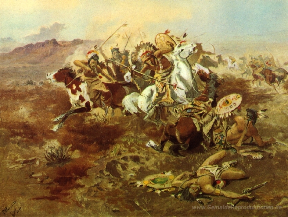 Wir bieten Ihnen eine handgefertigte Reproduktion auf Leinwand des berühmten Kunstwerks 'Indian Kampf, # 1' von Charles M. Russell, aus dem Reproduktionsmuseum.