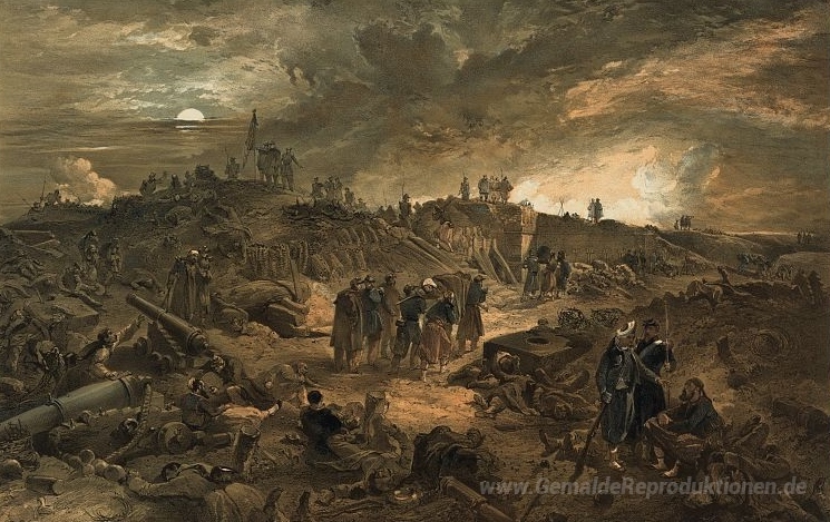 Wir bieten Ihnen eine handgefertigte Reproduktion auf Leinwand des berühmten Kunstwerks 'Innenansicht der Malakoff mit Überresten des runden Turm' von William Simpson, aus dem Reproduktionsmuseum.