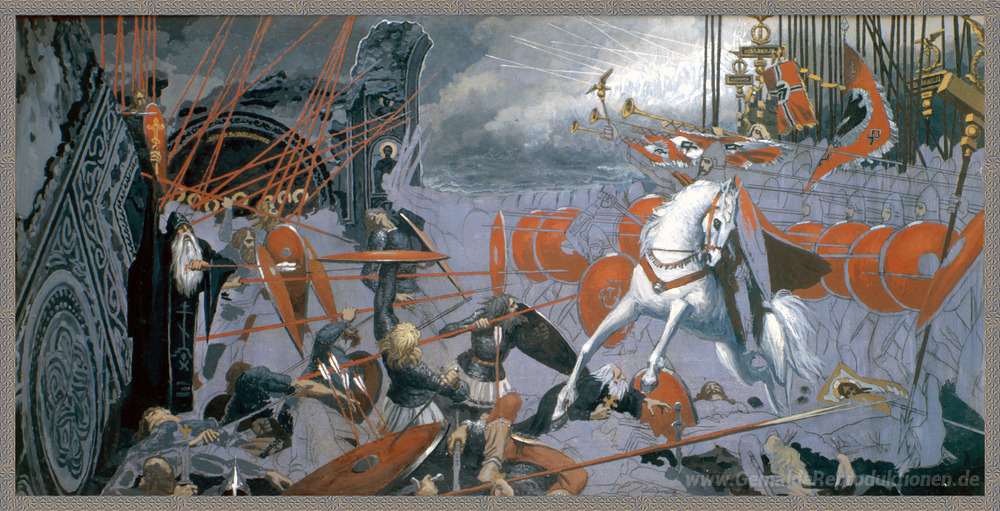 Wir bieten Ihnen eine handgefertigte Reproduktion auf Leinwand des berühmten Kunstwerks 'Invasion' von Konstantin Vasilyev, aus dem Reproduktionsmuseum.