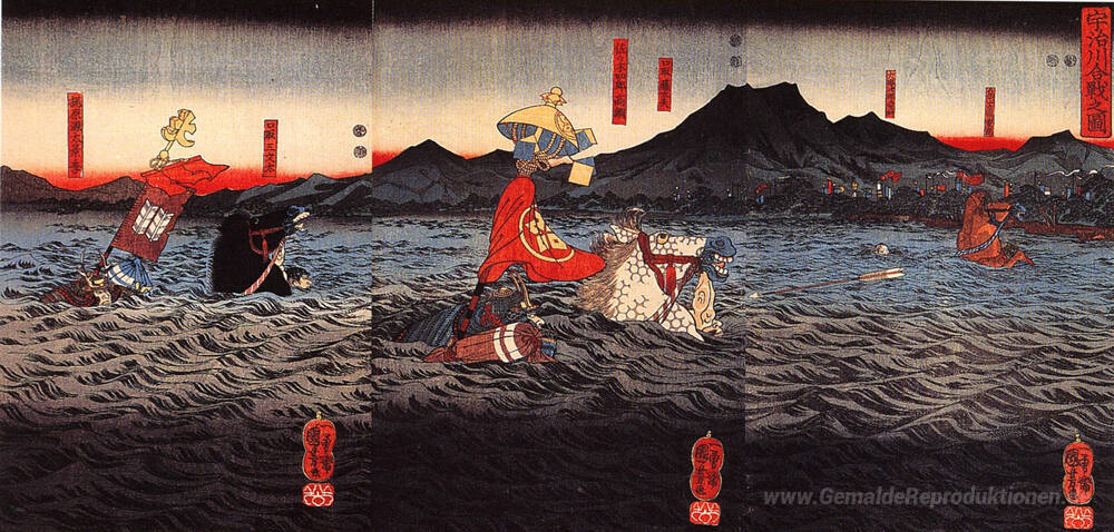 Wir bieten Ihnen eine handgefertigte Reproduktion auf Leinwand des berühmten Kunstwerks 'Kagesue, Takatsuna und Shigetada Überqueren der Uji Fluss' von Utagawa Kuniyoshi, aus dem Reproduktionsmuseum.