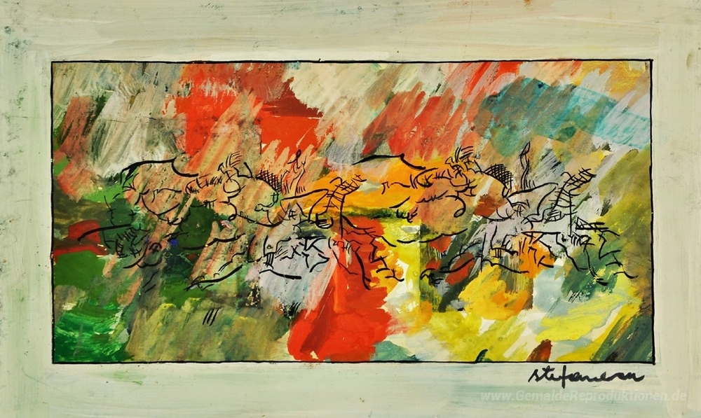 Wir bieten Ihnen eine handgefertigte Reproduktion auf Leinwand des berühmten Kunstwerks 'Kavalkade' von George Stefanescu-Ramnic , aus dem Reproduktionsmuseum.