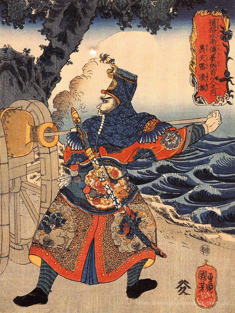 Wir bieten Ihnen eine handgefertigte Reproduktion auf Leinwand des berühmten Kunstwerks 'Kotenrai Ryioshin Laden einer Connon' von Utagawa Kuniyoshi, aus dem Reproduktionsmuseum.