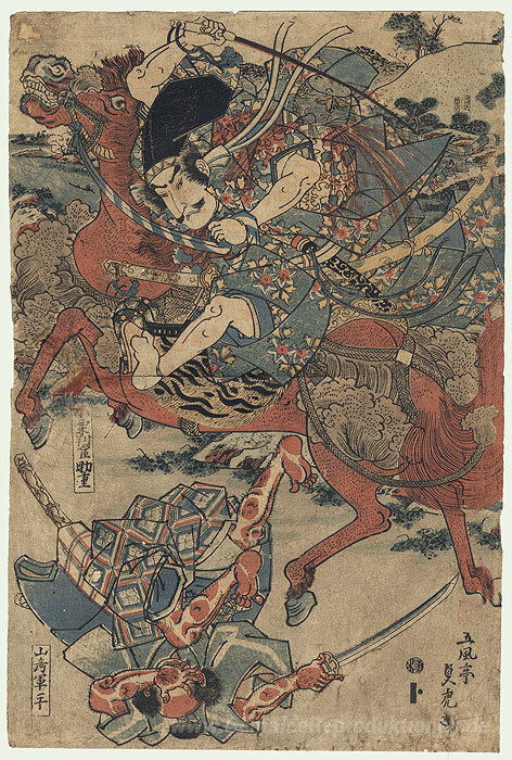 Wir bieten Ihnen eine handgefertigte Reproduktion auf Leinwand des berühmten Kunstwerks 'Oguri Hangan Sukeshige und Yamasaki' von Utagawa Sadatora, aus dem Reproduktionsmuseum.