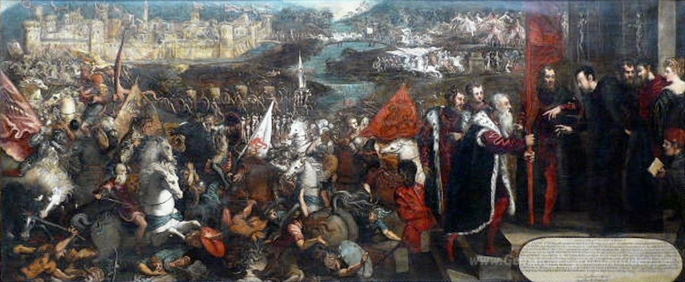 Wir bieten Ihnen eine handgefertigte Reproduktion auf Leinwand des berühmten Kunstwerks 'Schlacht von Asola' von Tintoretto, aus dem Reproduktionsmuseum.