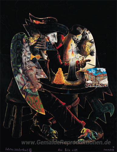 Wir bieten Ihnen eine handgefertigte Reproduktion auf Leinwand des berühmten Kunstwerks 'Das Bild ruft (letztes Selbstportrait I)' von Jorg Immendorff, aus dem Reproduktionsmuseum.