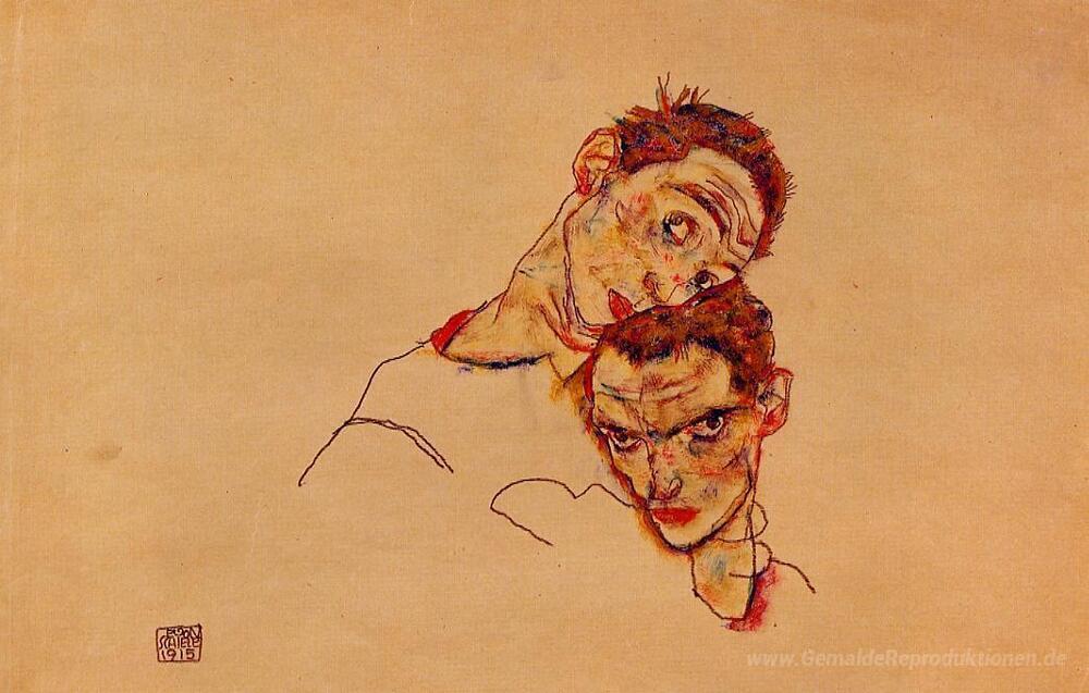 Wir bieten Ihnen eine handgefertigte Reproduktion auf Leinwand des berühmten Kunstwerks 'Doppelselbstporträt' von Egon Schiele, aus dem Reproduktionsmuseum.