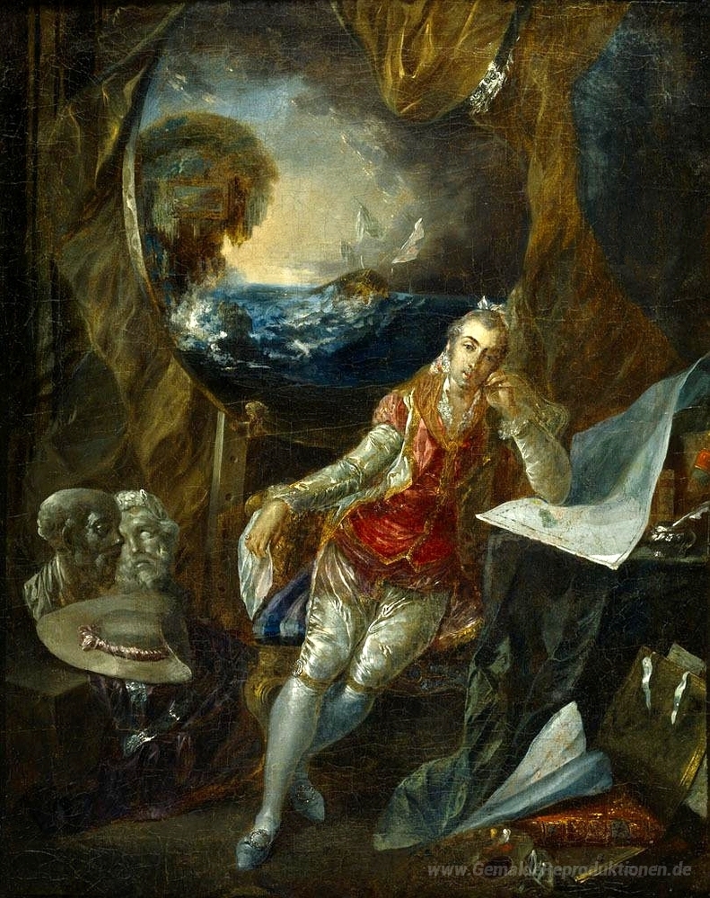 Wir bieten Ihnen eine handgefertigte Reproduktion auf Leinwand des berühmten Kunstwerks 'Selbstbildnis im Atelier' von Luis Paret y Alcazar, aus dem Reproduktionsmuseum.