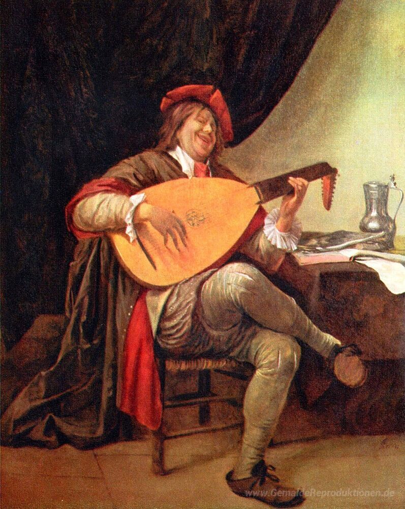 Wir bieten Ihnen eine handgefertigte Reproduktion auf Leinwand des berühmten Kunstwerks 'Selbstbildnis mit Laute' von Jan Steen, aus dem Reproduktionsmuseum.