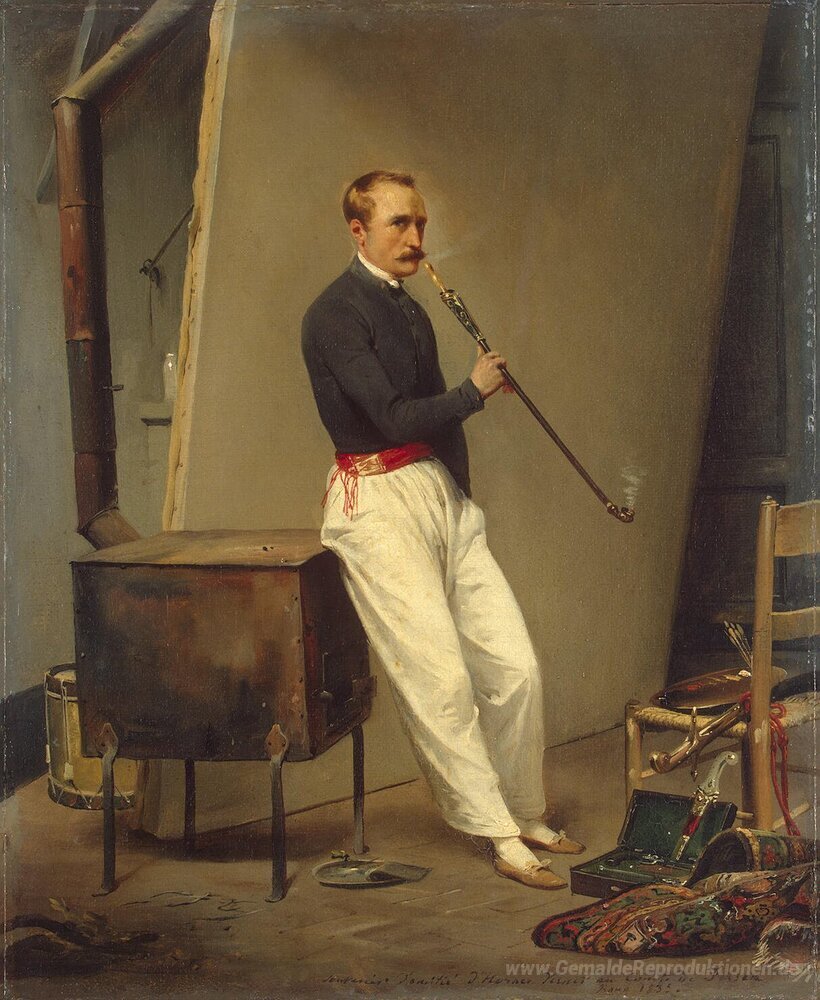 Wir bieten Ihnen eine handgefertigte Reproduktion auf Leinwand des berühmten Kunstwerks 'Selbstbildnis mit Pfeife' von Horace Vernet, aus dem Reproduktionsmuseum.