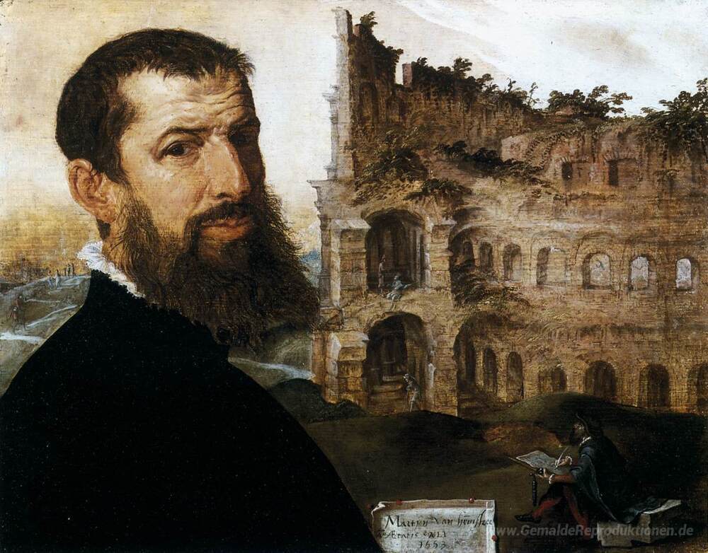 Willkommen in unserer exquisiten Kollektion von Ölgemälden, in der sich Kunst und Emotion vereinen. Jedes Werk erzählt eine Geschichte, und das Selbstporträt des Malers mit dem Kolosseum im Hintergrund von Maerten van Heemskerck ist ein herausragendes Beispiel für meisterliche Handwerkskunst. Van Heemskerck, ein bedeutender Renaissancekünstler, vereint in dieser Komposition beeindruckend feine Details und lebendige Farben, die den Betrachter in eine vergangene Epoche entführen.