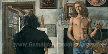 Wir bieten Ihnen eine handgefertigte Reproduktion auf Leinwand des berühmten Kunstwerks 'Selbstporträt des Malers mit seinem Modell' von Yiannis Tsaroychis, aus dem Reproduktionsmuseum.