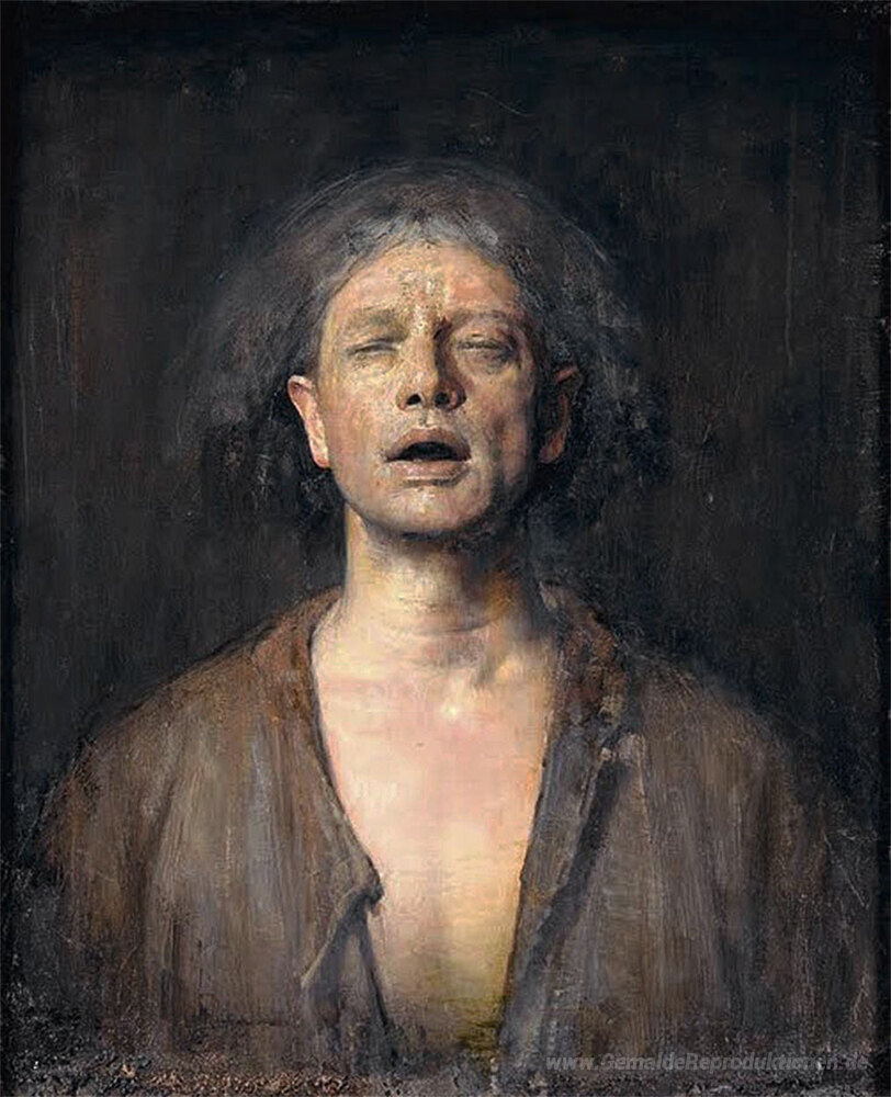 Wir bieten Ihnen eine handgefertigte Reproduktion auf Leinwand des berühmten Kunstwerks 'Selbstporträt mit Augen geschlossen' von Odd Nerdrum, aus dem Reproduktionsmuseum.