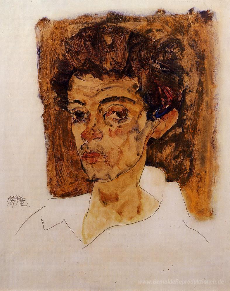 Wir bieten Ihnen eine handgefertigte Reproduktion auf Leinwand des berühmten Kunstwerks 'Selbstporträt mit Brown-Hintergrund' von Egon Schiele, aus dem Reproduktionsmuseum.