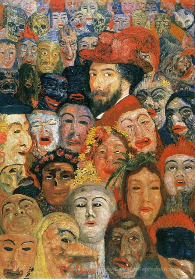 Wir bieten Ihnen eine handgefertigte Reproduktion auf Leinwand des berühmten Kunstwerks 'Selbstporträt mit Masken' von James Ensor, aus dem Reproduktionsmuseum.