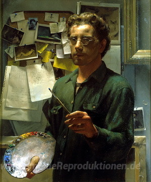 Wir bieten Ihnen eine handgefertigte Reproduktion auf Leinwand des berühmten Kunstwerks 'Selbstporträt mit Palette' von Jacob Collins, aus dem Reproduktionsmuseum.
