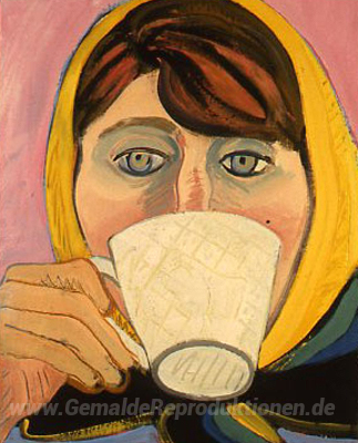 Wir bieten Ihnen eine handgefertigte Reproduktion auf Leinwand des berühmten Kunstwerks 'Self-Portrait in Schal-trinkenden Tee' von Joan Brown, aus dem Reproduktionsmuseum.