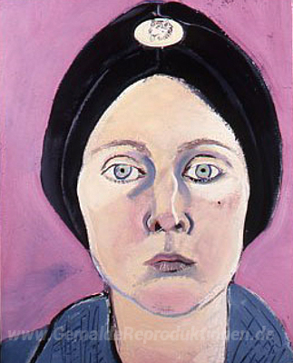 Wir bieten Ihnen eine handgefertigte Reproduktion auf Leinwand des berühmten Kunstwerks 'Self-Portrait in Turban mit Eskimo Dog Pin' von Joan Brown, aus dem Reproduktionsmuseum.