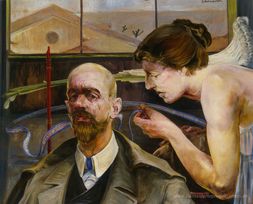 Wir bieten Ihnen eine handgefertigte Reproduktion auf Leinwand des berühmten Kunstwerks 'Self-Portrait' von Jacek Malczewski, aus dem Reproduktionsmuseum.