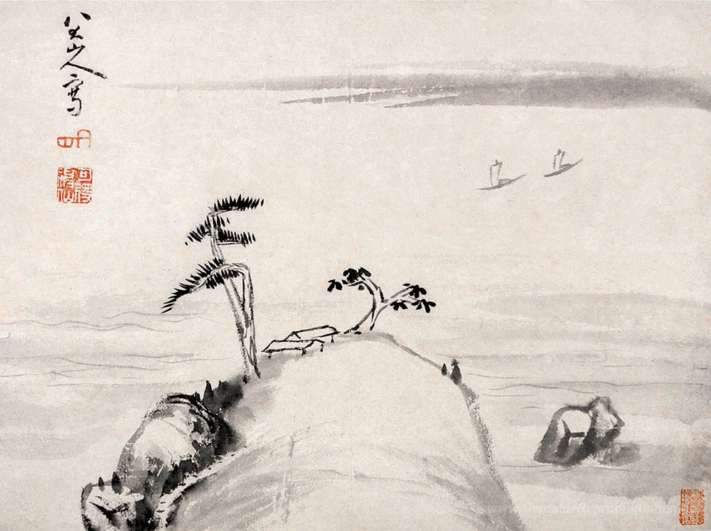 Wir bieten Ihnen eine handgefertigte Reproduktion auf Leinwand des berühmten Kunstwerks 'Landschaft (Album Leaf)' von Bada Shanren, aus dem Reproduktionsmuseum.
