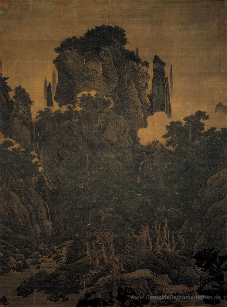 Wir bieten Ihnen eine handgefertigte Reproduktion auf Leinwand des berühmten Kunstwerks 'Wind in den Kiefern in einem Felstal' von Li Tang, aus dem Reproduktionsmuseum.