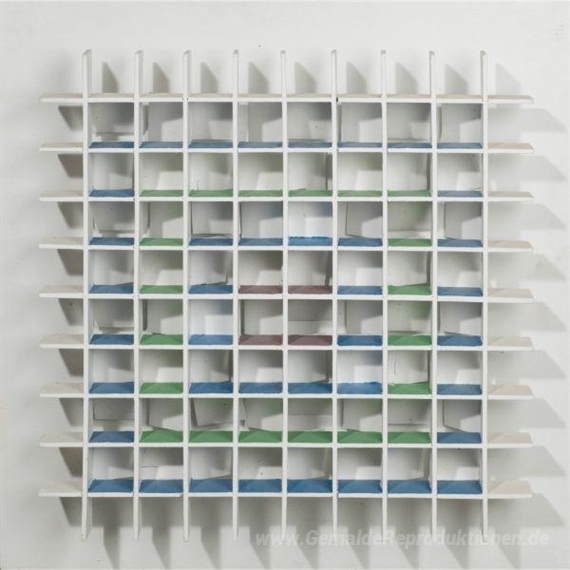 Wir bieten Ihnen eine handgefertigte Reproduktion auf Leinwand des berühmten Kunstwerks 'Atmosphère Chromoplastique N ° 120' von Luis Tomasello, aus dem Reproduktionsmuseum.