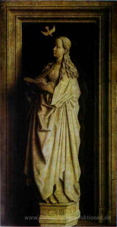 Wir bieten Ihnen eine handgefertigte Reproduktion auf Leinwand des berühmten Kunstwerks 'Die Verkündigung' von Jan van Eyck, aus dem Reproduktionsmuseum.