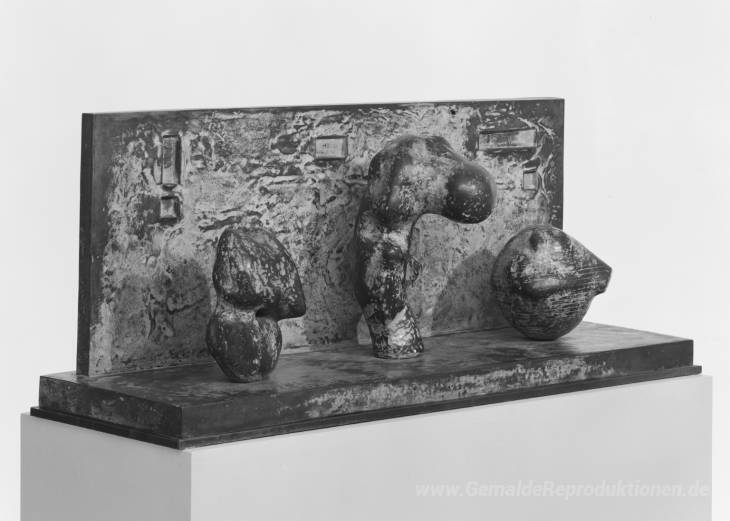 Wir bieten Ihnen eine handgefertigte Reproduktion auf Leinwand des berühmten Kunstwerks 'Drei Motive gegen die Wall No. 2' von Henry Moore, aus dem Reproduktionsmuseum.