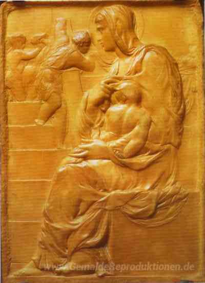 Wir bieten Ihnen eine handgefertigte Reproduktion auf Leinwand des berühmten Kunstwerks 'Madonna der Treppe' von Michelangelo, aus dem Reproduktionsmuseum.