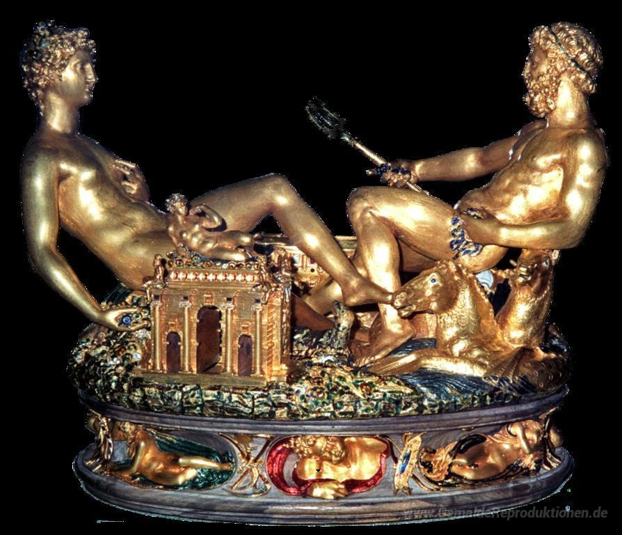 Wir bieten Ihnen eine handgefertigte Reproduktion auf Leinwand des berühmten Kunstwerks 'Saliera' von Benvenuto Cellini, aus dem Reproduktionsmuseum.