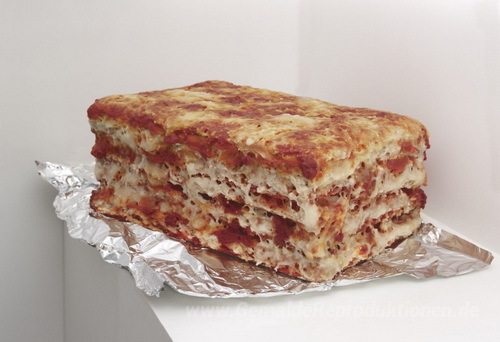 Wir bieten Ihnen eine handgefertigte Reproduktion auf Leinwand des berühmten Kunstwerks 'Une Teil de Lasagne al forno à emporter' von Michel Blazy, aus dem Reproduktionsmuseum.