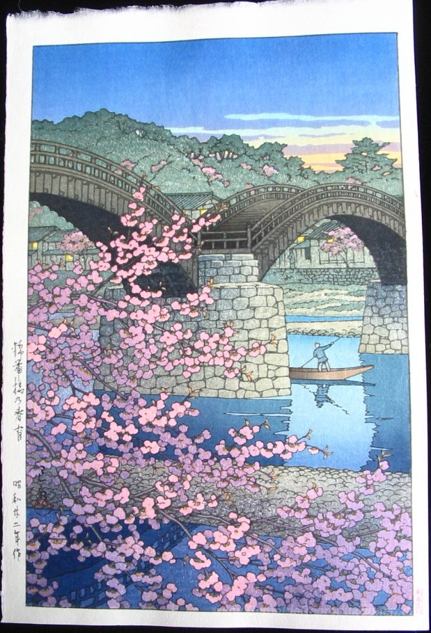 Wir bieten Ihnen eine handgefertigte Reproduktion auf Leinwand des berühmten Kunstwerks 'Abendstimmung am Kintai-Brücke im Frühjahr' von Hasui Kawase, aus dem Reproduktionsmuseum.