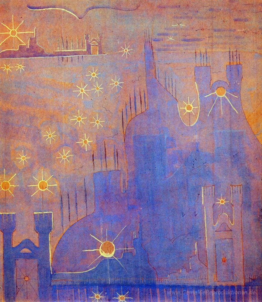 Wir bieten Ihnen eine handgefertigte Reproduktion auf Leinwand des berühmten Kunstwerks 'Allegro (Sonata der Sonne)' von Mikalojus Ciurlionis, aus dem Reproduktionsmuseum.