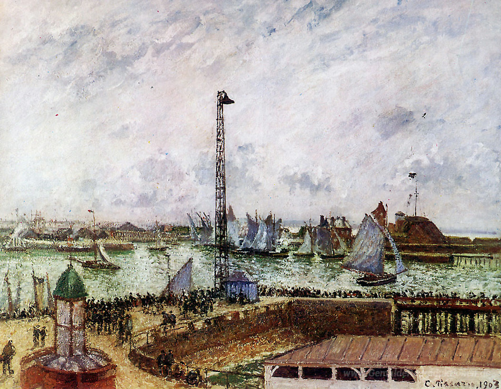 Wir bieten Ihnen eine handgefertigte Reproduktion auf Leinwand des berühmten Kunstwerks 'Anlegestelle des Pilot, Le Havre' von Camille Pissarro, aus dem Reproduktionsmuseum.